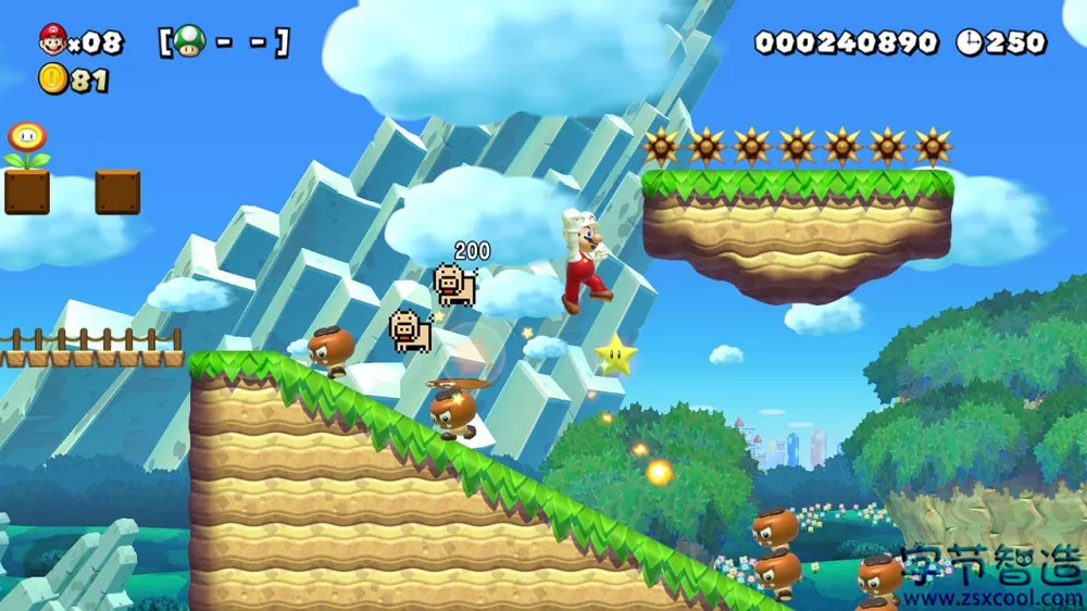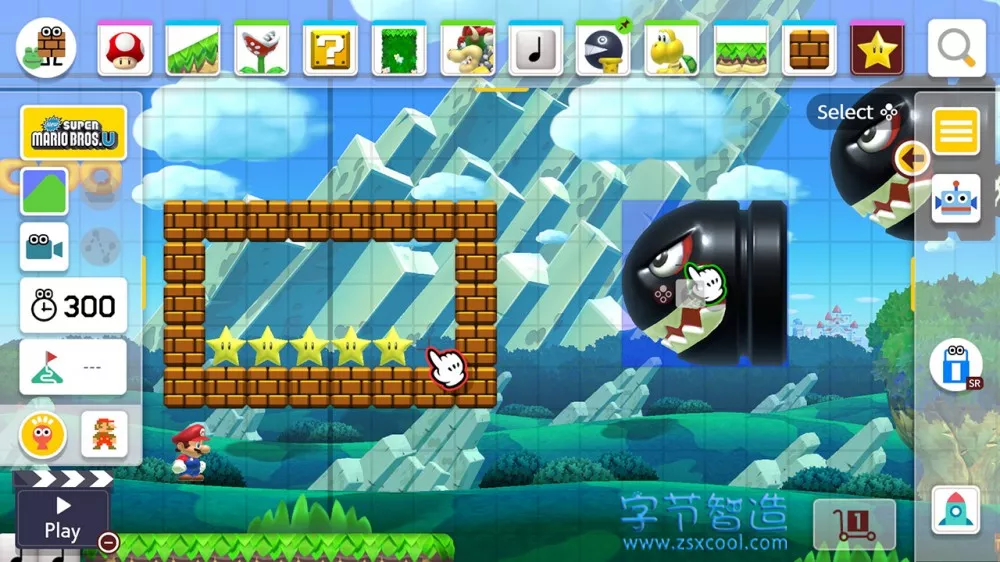 本作中玩家们能够利用本作提供的素材来打造关卡,本作中可通过网络来分享自己创造的关卡,也可下载其他玩家的关卡来挑战。