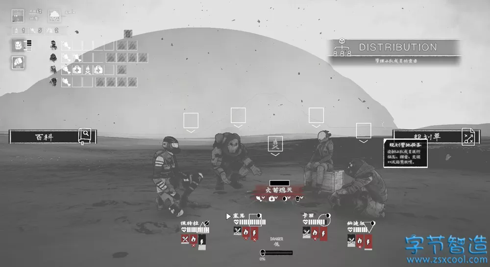 你需要管理所有的食物、装备和药物,并保护你的队员不陷入疯狂和绝望之中。在荒野中寻找并收集关键的资源,保证队伍的生存。
