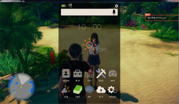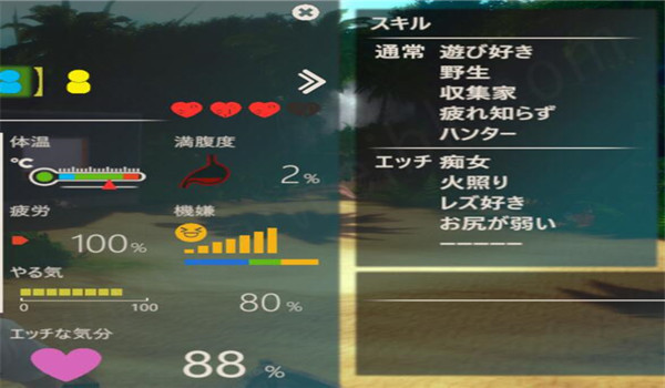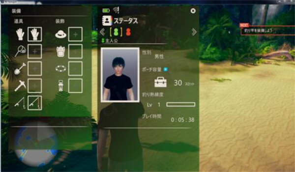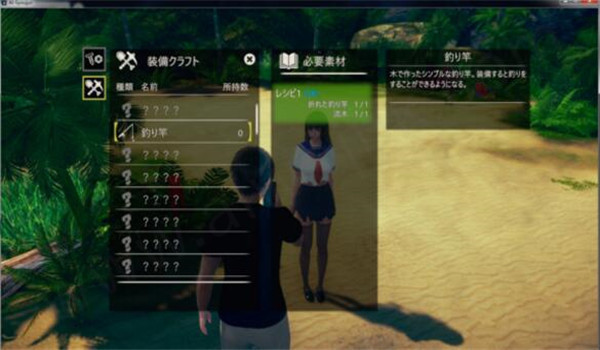 制造完钓鱼竿后解锁资讯选项,这里可以给人物装备道具,还可以看妹子的状态,其他状态后面再说,妹子右边的技能需要等好感有三心后解锁,三心后还会解锁心情和状态。