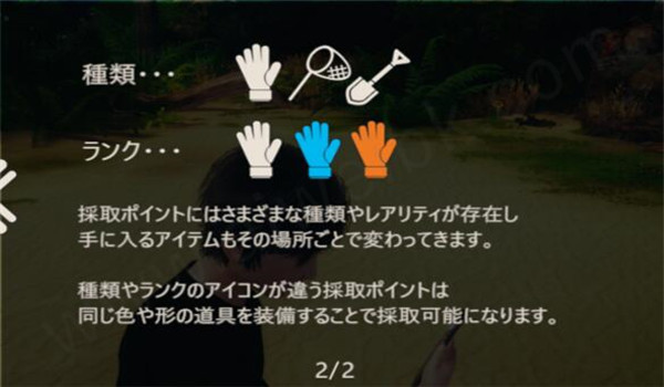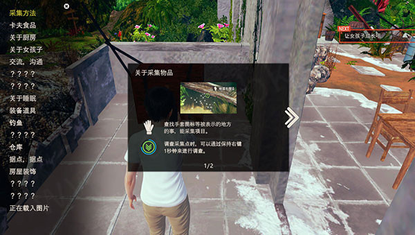 谈话过后会获得一把破损钓鱼竿,需要收集木头修补,M键可以打开大地图,手套图示是可以直接收集,虫网需要捕虫网,铲子锄头同理,颜色代表收集所需的道具等级,橙色等级最高。
