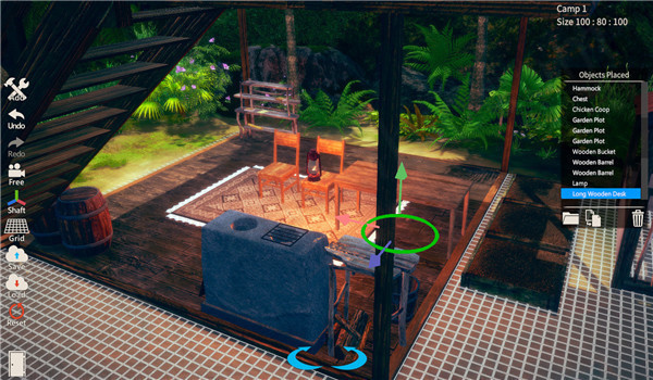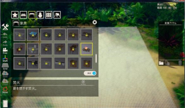 右击看板选择第一项进入家具摆放,右边用的多就ADD和Shaft,ADD是家具清单,可以在家具选项找到篝火,点击决定直接放置,shaft点开之后右侧列表选中篝火会出现三轴线可以移动家具,摆放完毕后左下角退出。