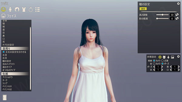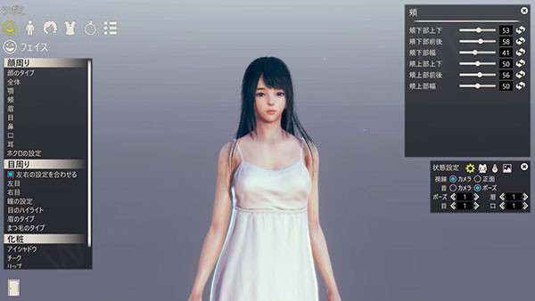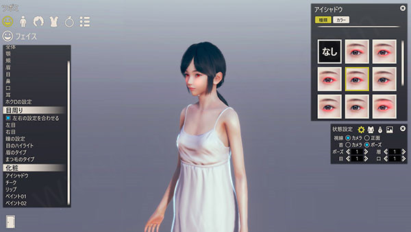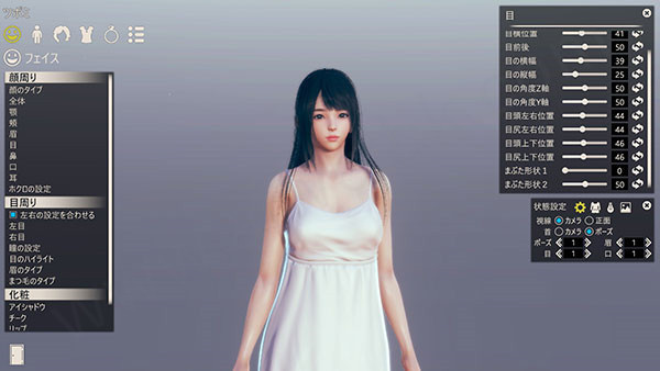 目、鼻、口、耳分别对应五官的细致调控。眼睛方面可以调节眼睛的位置和眼角的高低(决定了眼型),眼睛的位置游戏设计的很贴心,默认给的就是最佳值就不需要大动除非是有特殊癖好人士。外眼角(目尻)和内眼角(目头)的位置调节可以用来调整眼型,两端保持平行这样的眼型在现在算是比较主流的可爱系设定,当然如果喜欢帅气一点的类型那么就将外眼角稍微太高一点即可,此外眼睛还提供了眼睑(まぶた)的选择。鼻子详细到能捏整个鼻子的造型,前后角度,鼻翼的宽度和鼻子的高度等。嘴巴方面的调整和眼睛比较类似,除了大小属性的基础调整外,还可以调整嘴角的高低,像甜美系给人的刻板影响就是微微上扬而高冷一些的则保持水平。这里很多选项看似用不上不过I社都做得非常齐全给玩家提供了充分的选择。