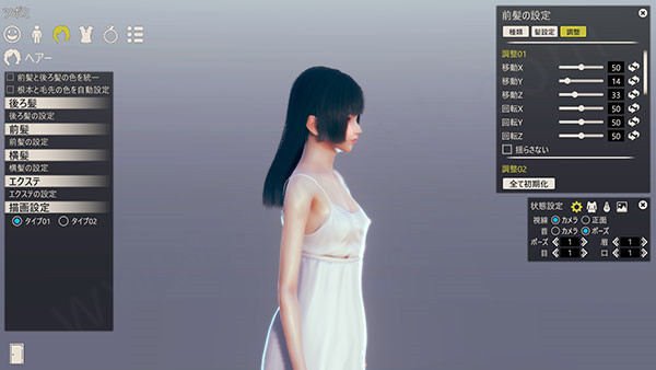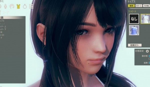 如果说相比前作捏人细致的程度变化并不是特别明显的话,那么在服装方面可算得上是非常亮眼了。虽然服装数量在游戏中并没有给出多少选择,目前只提供了一套基本的泳衣、一个连身裙、还有内衣和牛仔裤,至于鞋子、袜子和手套这些都没有什么选择只是给玩家看一下分类,玩家也可以对服装进行颜色和花纹的调整等。值得一提的是服装系统加入了一个新的“材质”和“破损”的设定。破损很好理解,材质设定类似于让服装偏向缎面的设定,这里为了更好理解一点就用裤袜来解释。