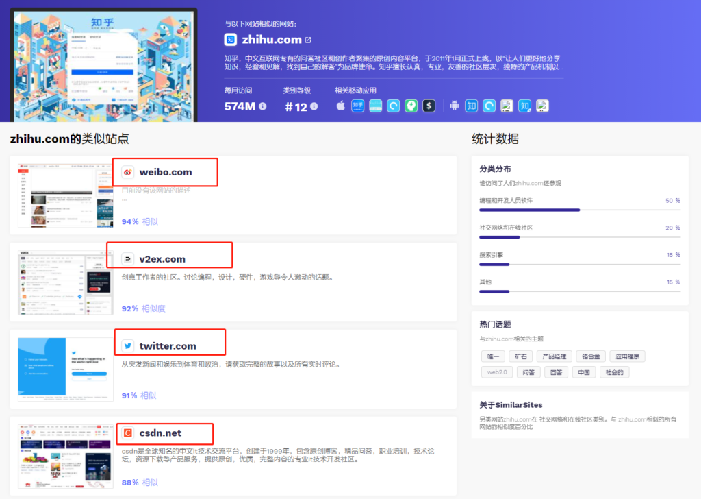 与知乎相似的网站有微博、V2ex、推特、CSDN等等,除了了解相似网站有哪些,我们还可以了解访问知乎的用户有哪些特点,比如这里就统计显示了有50%的的编程、开发人员、软件相关。