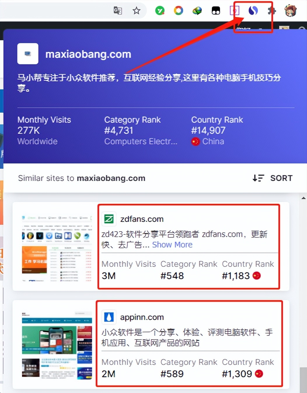 插件只有谷歌内核的浏览器可以使用,在浏览器安装后,需要找哪个网站的同类网站,只需要点一下有右上角的SimilarSites插件图标即可。