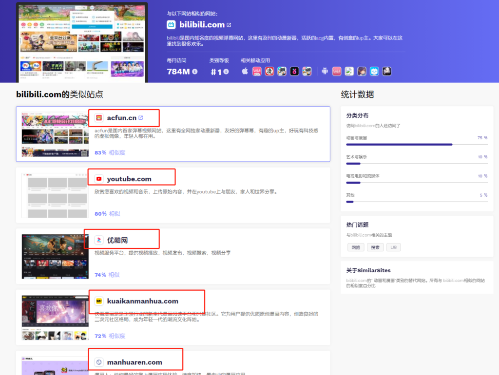 比如我们喜欢看B站但B站的内容已经无法满足了,这款网站会根据B站的属性给你推荐出了类似的网站:AcFun 、YouTube、优酷、快慢、漫画人、M站等等,还会给出每个网站的相似度!