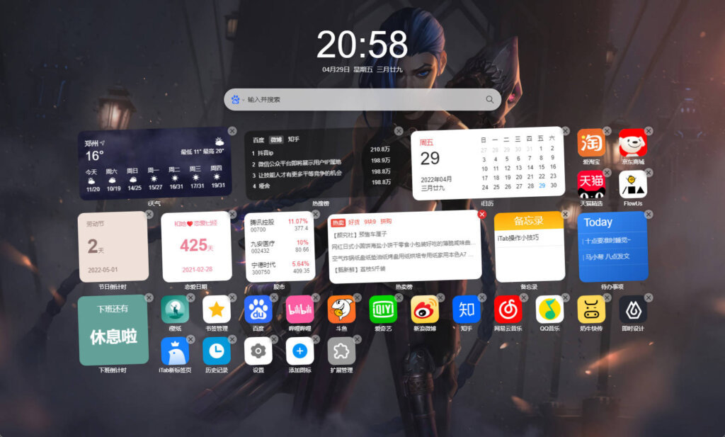 强大的自定义功能,几乎每一项功能你都可以在设置中来修改他们的属性,比如颜色、大小、样式、布局等等。只为让你制作出属于你自己独有的新标签页。