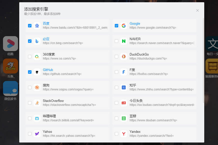 新标签页最重要功能之一搜索,内置19种搜索引擎,可以一次性添加8种搜索引擎,使用快捷键 Tab 可快速切换搜索引擎。