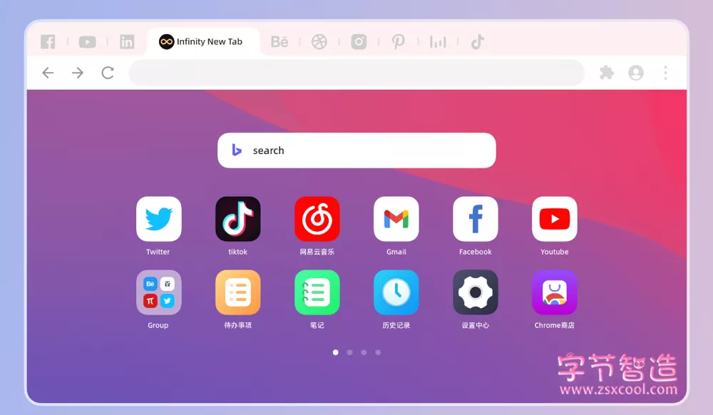 1、图标:通过Infinity自定义添加你喜爱的网站,只需一步,就能将任何网站添加到你的新标签页中。我们为这些网站重绘了上千精美图标,或者你也可以选择自定义图标并分享给其他人。 图标支持拖拽放置,同时,Infinity新标签页还提供图标大小、圆角弧度、行列间距、布局方式等个性化设置,使Chrome新标签页更贴合每个用户的使用习惯。
